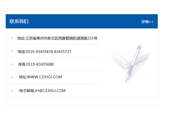 傳真:0519-83435688    郵編:213135    網址:WWW.czjhgj_com.pcling.com    電子郵箱:JH@czjhgj_com.pcling.com